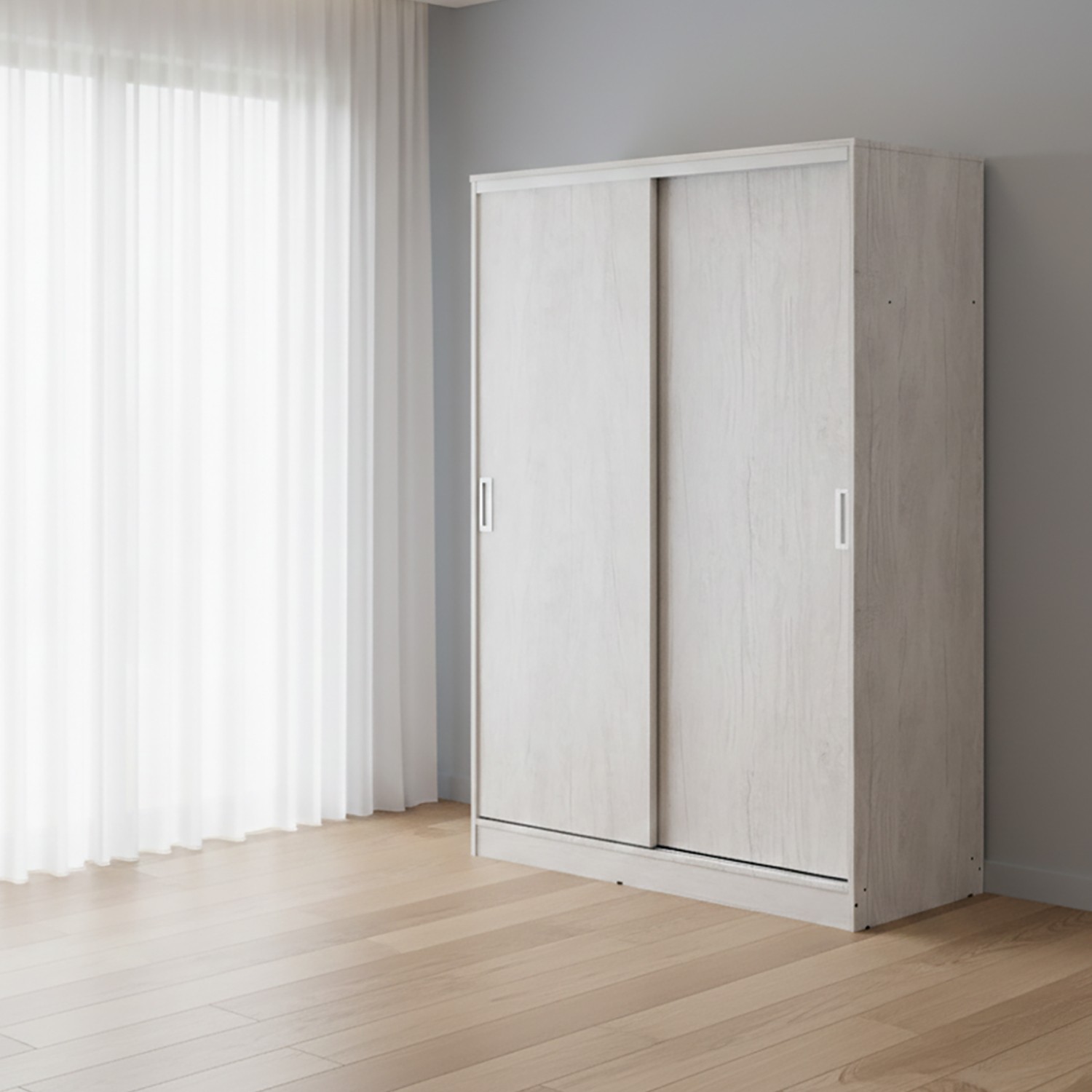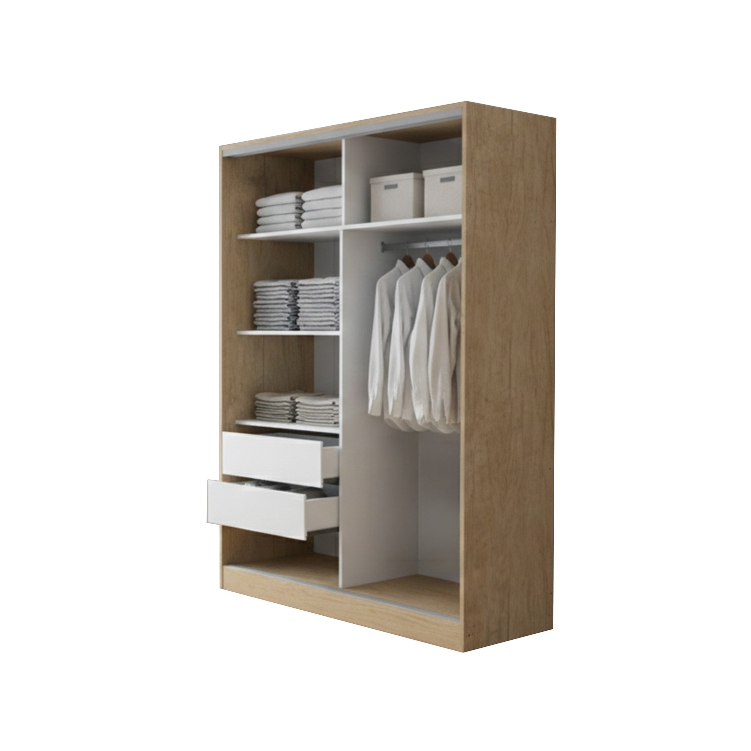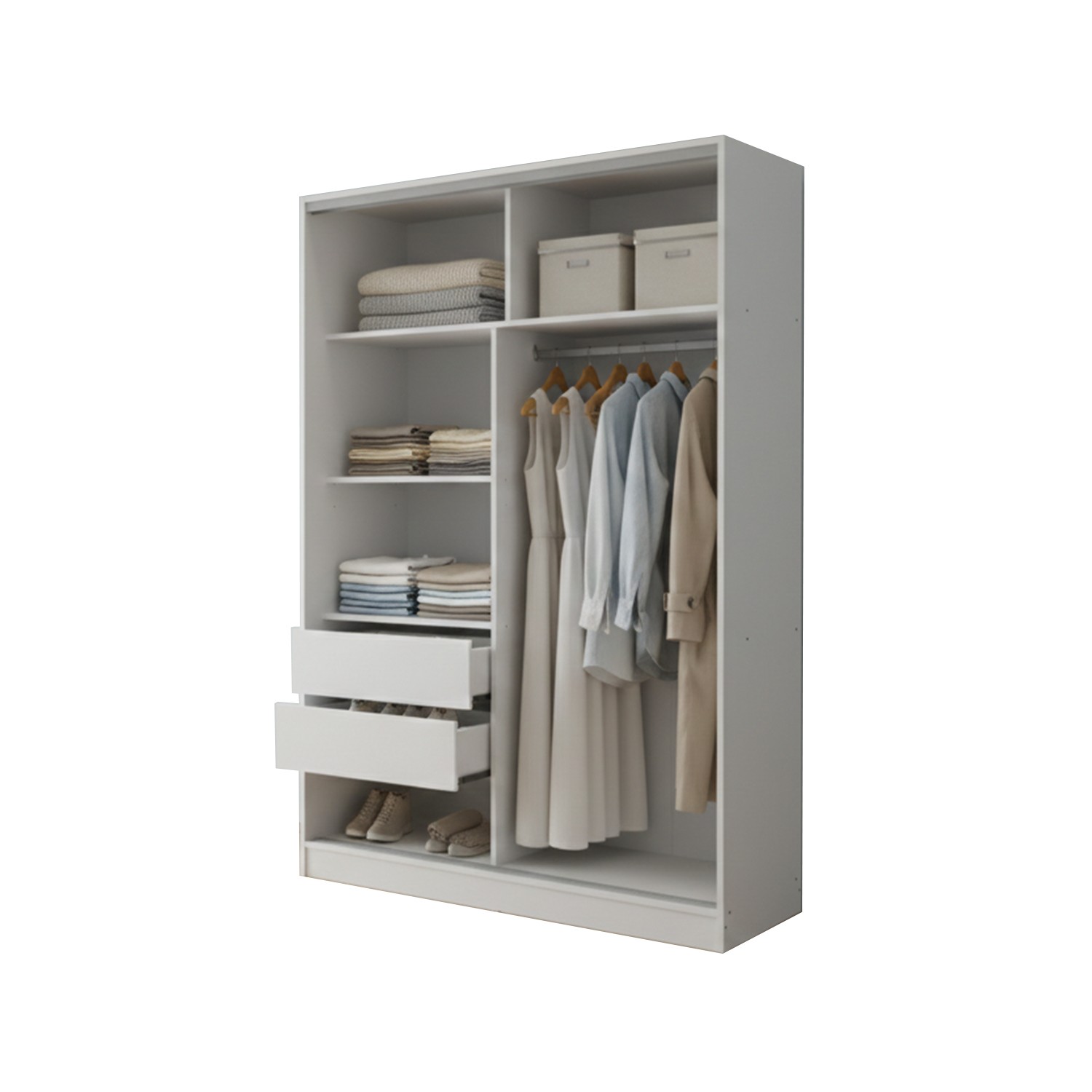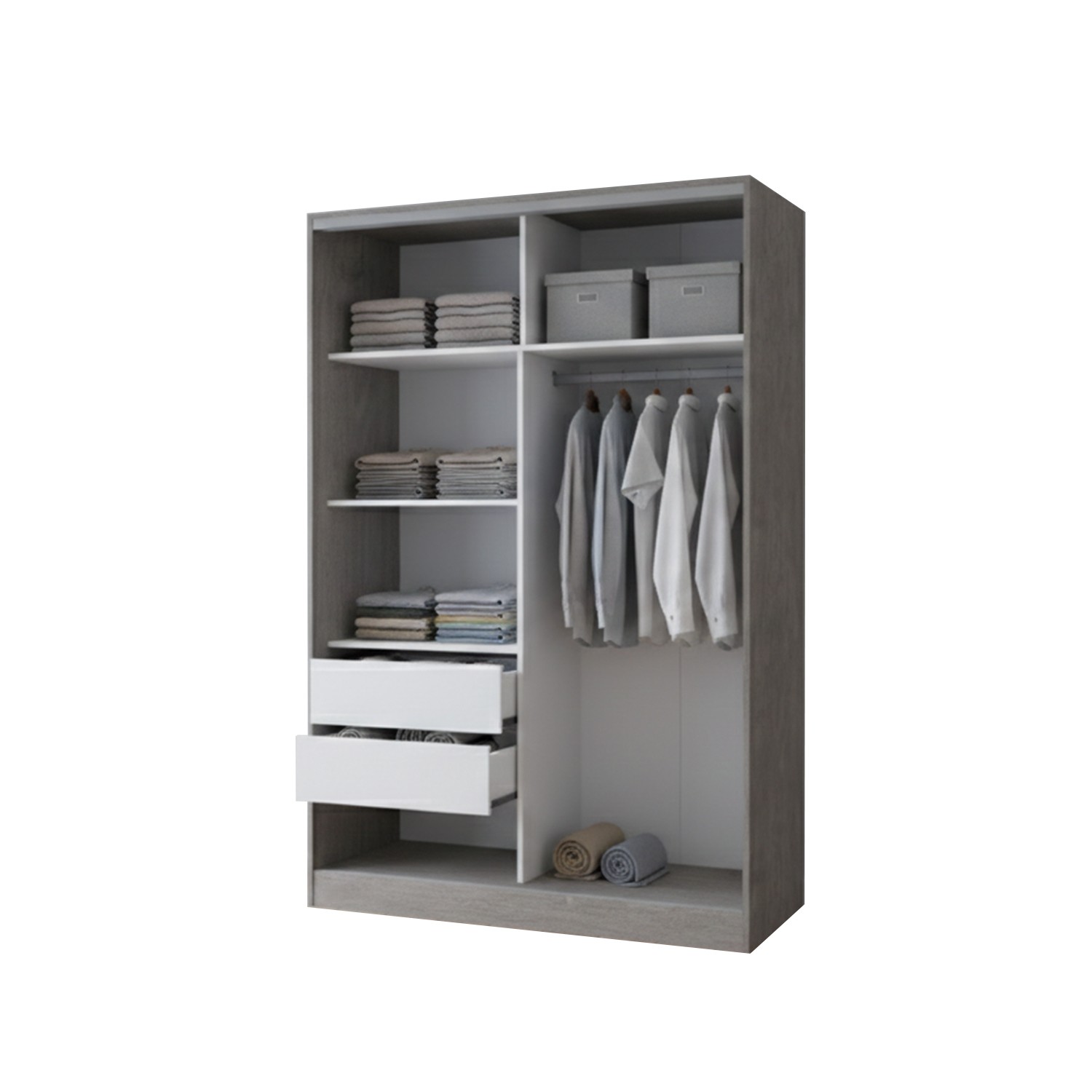 Este placard cuenta con dos puertas corredizas que optimizan el espacio, permitiendo un acceso fácil y cómodo a su interior. Equipado con dos cajones y cuatro estantes, ofrece una capacidad de peso de hasta 80 kg, ideal para organizar ropa, calzado y accesorios de manera eficiente. Su estructura de MDP garantiza durabilidad y resistencia, asegurando que tu inversión se mantenga en excelente estado a lo largo del tiempo.