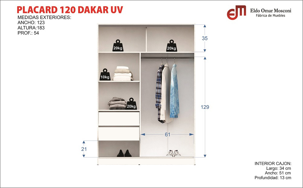 El Placard 22 Dakar es un ropero angosto pensado para espacios reducidos.Todo su exterior es de melamina y el interior se encuentra revestido.Cuenta con dos cajones cuyas correderas son metálicas.