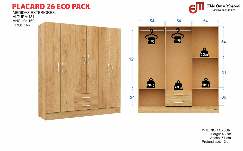 El Placard 22 Dakar es un ropero angosto pensado para espacios reducidos.Todo su exterior es de melamina y el interior se encuentra revestido.Cuenta con dos cajones cuyas correderas son metálicas.