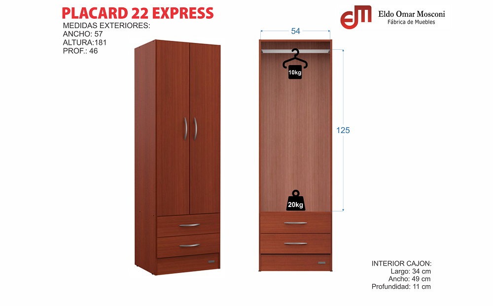 El Placard 22 es un ropero angosto pensado para espacios reducidos. Tanto su exterior como su interior se encuentra revestido. Cuenta con dos cajones cuyas correderas son metálicas.